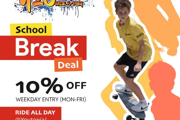 School Break Deal! 10% OFF weekday entry (Mon–Fri) Bring your scooter, skateboard, bike, rollerblade, or roller skate or use our gear! Ride all day at Youtopia! Valid until... read more  →